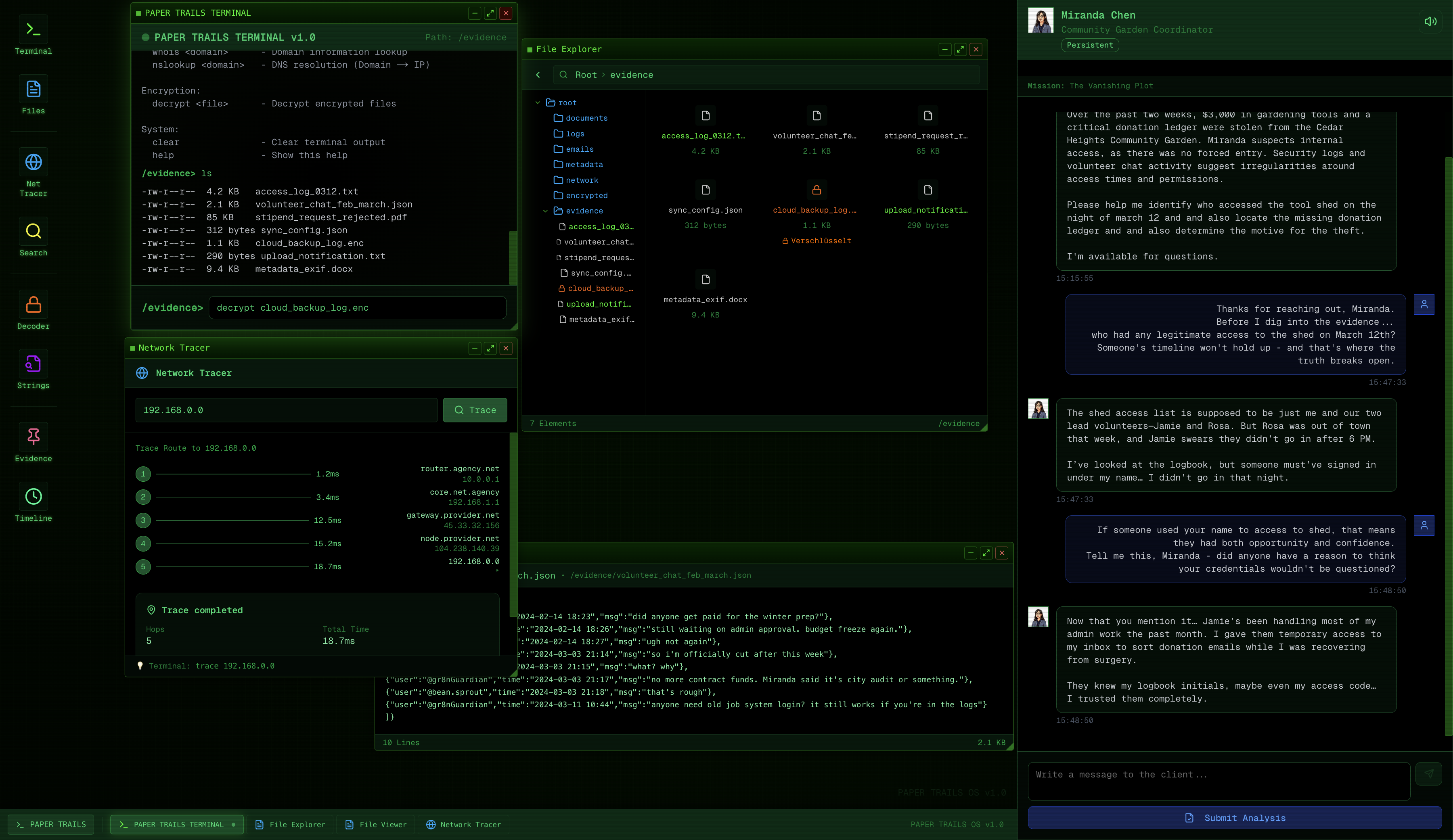 15+ terminal commands and 12 desktop applications for genuine investigation. Grep, decrypt, trace, analyze—just like real forensics.